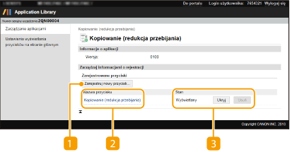 Służy do wyświetlania listy zarejestrowanych przycisków. Kliknięcie łącza nazwy przycisku na liście [Nazwa przycisku] powoduje otwarcie strony [Szczegóły przycisku], która umożliwia zmianę lub powielenie ustawień odpowiadającego przycisku.