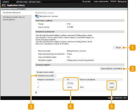 Służy do otwierania strony [Edycja ustawień podstawowych]. Na tej stronie można zmienić nazwę przycisku, skonfigurować ustawienie tak, aby na ekranie głównym automatycznie wyświetlane były przełączniki do wyświetlania slajdu, oraz ustawić czas wyświetlania każdego slajdu.