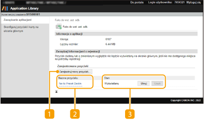 Służy do wyświetlania listy zarejestrowanych przycisków. Kliknięcie łącza nazwy przycisku na liście [Nazwa przycisku] powoduje otwarcie strony [Szczegóły przycisku], która umożliwia zmianę lub powielenie ustawień odpowiadającego przycisku.
