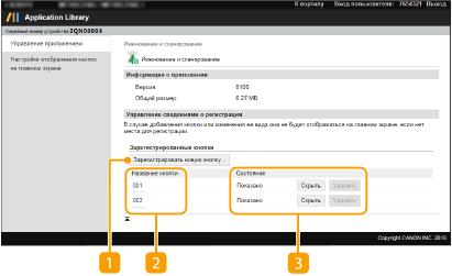 Отображает список зарегистрированных кнопок. Если щелкнуть ссылку имени кнопки в списке [Название кнопки], откроется страница [Сведения о кнопке], на которой можно изменить или дублировать настройки соответствующей кнопки.