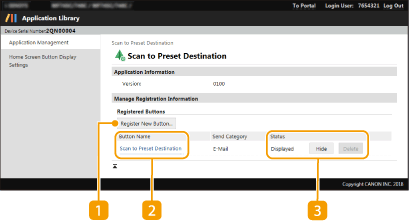 Avab lehe [Register New Button]. Sellel lehel saate määrata sihtkohta, skannimisformaati ja avaekraanil kuvatava nupu nime.
