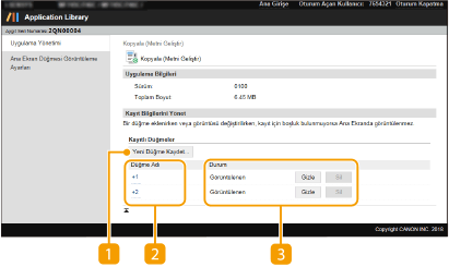 Kayıtlı düğmelerin listesini görüntüler. [Düğme Adı] listesinde bir düğme adının bağlantısına tıklanınca, o düğmenin ayarlarını değiştirebileceğiniz veya kopyalayabileceğiniz [Düğme Ayrıntıları] sayfası açılır.