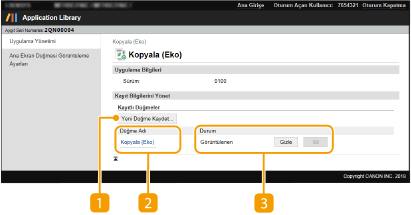 [Yeni Düğme Kaydet] sayfasını açar. Bu sayfada kopya oranını, N sayfa 1 arada ayarını ve Ana Ekranda görüntülenecek düğme adını belirtebilirsiniz.