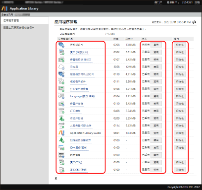 显示安装在机器上的应用程序列表。在 [应用程序名称] 列表中单击某个应用程序的链接后,将显示该应用程序的设置屏幕。