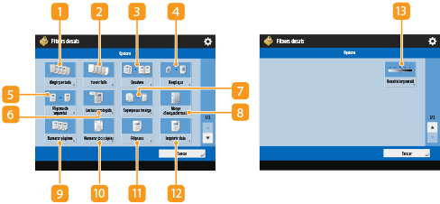 Si premeu <Fitxers desats> a la pantalla <Menú principal> i, a continuació, premeu <Bústia>, <Espai avançat>, <Xarxa> o <Dispositiu memòria> per imprimir fitxers, es mostrarà la pantalla d'opcions següent.