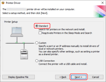 [Search Again]: Click this if the device is not displayed in [Printer List]. If the device is still not displayed after re-searching, select [Custom] and install by specifying a port or IP address.
