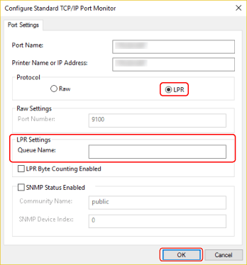 (1) Select [LPR] for [Protocol] → specify one of the print queues for [Queue Name] in [LPR Settings].