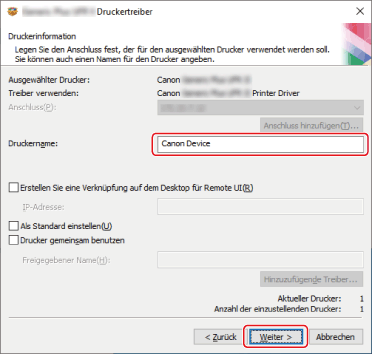 Ändern Sie bei Bedarf [Druckername] → Klicken Sie auf [Weiter].