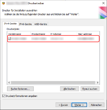 [IPv4-Geräte]/[IPv6-Geräte]/[WSD-Geräte]-Registerkarte: Die Suchergebnisse werden auf der Registerkarte entsprechend der Verbindungsmethode des Geräts angezeigt. Klicken Sie zum Wechseln auf eine Registerkarte.