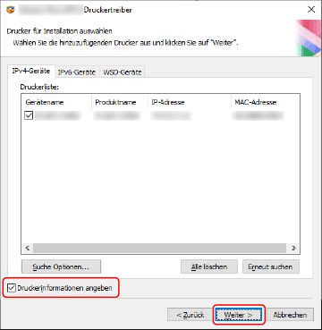 Wenn Sie den Gerätenamen ändern oder das Gerät als Standard festlegen möchten, wählen Sie [Druckerinformationen angeben] → Klicken Sie auf [Weiter].