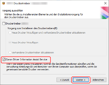 Abbruch der Treiberauswahl → Wählen Sie [Canon Driver Information Assist Service] aus → Klicken Sie auf [Weiter].