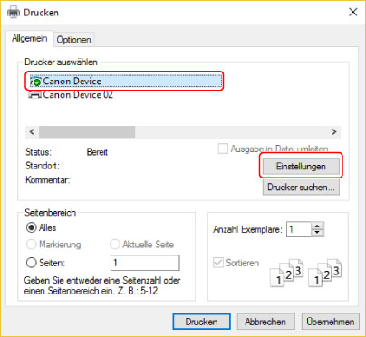 Je nach Anwendung werden [Einstellungen] möglicherweise als "Druckereigenschaften" oder "Eigenschaften" bezeichnet.
