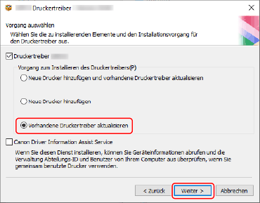 Wählen Sie [Vorhandene Druckertreiber aktualisieren] für [Vorgang zum Installieren des Druckertreibers] aus → Klicken Sie auf [Weiter].