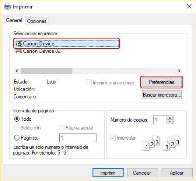 En función de la aplicación, [Preferencias] puede denominarse "Propiedades de impresora" o "Propiedades".