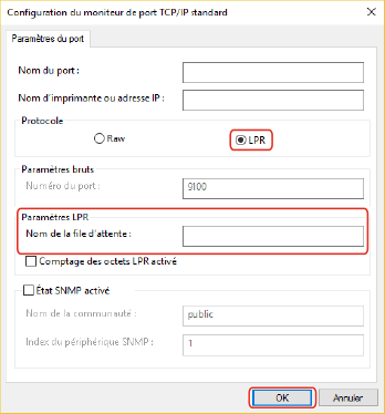 (1) Sélectionnez [LPR] pour [Protocole] → spécifiez l'une des files d'attente d'impression pour [Nom de la file d’attente] dans [Paramètres LPR].
