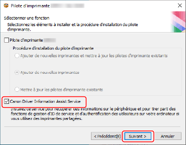 Annulez la sélection du pilote → sélectionnez [Canon Driver Information Assist Service] → cliquez sur [Suivant].