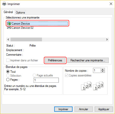 Dans certaines applications, l'option [Préférences] est appelée « Propriétés de l’imprimante » ou « Propriétés ».