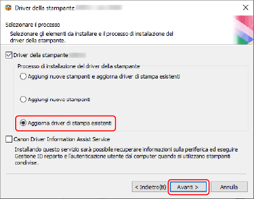 Selezionare [Aggiorna driver di stampa esistenti] per [Processo di installazione del driver della stampante] → fare clic su [Avanti].