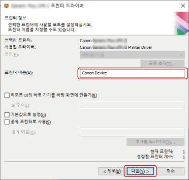 디바이스 이름을 변경하거나 디바이스를 기본 디바이스로 설정하려는 경우 [프린터 정보 설정]을 선택 → [다음]을 클릭합니다.