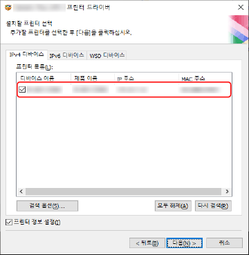 드라이버 설치 시 TCP/IP 네트워크에서 디바이스를 검색할 수 있습니다.