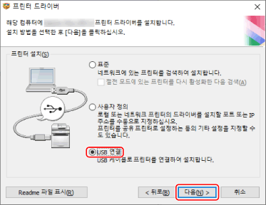(4) [연결 유형 선택] 화면이 표시되면, [USB 연결]을 선택 → [다음]을 클릭합니다.