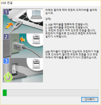 다음 화면이 나타나면 USB 케이블을 사용하여 디바이스와 컴퓨터를 연결 → 디바이스를 켭니다.