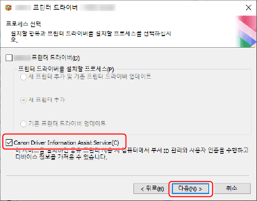 드라이버 선택 취소 → [Canon Driver Information Assist Service]를 선택 → [다음]을 클릭합니다.
