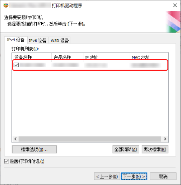[再次搜索]:如果在 [打印机列表] 中没有显示设备,可以单击此按钮。如果在重新搜索后仍未显示设备,请选择 [自定义],然后通过指定端口或 IP 地址来进行安装。