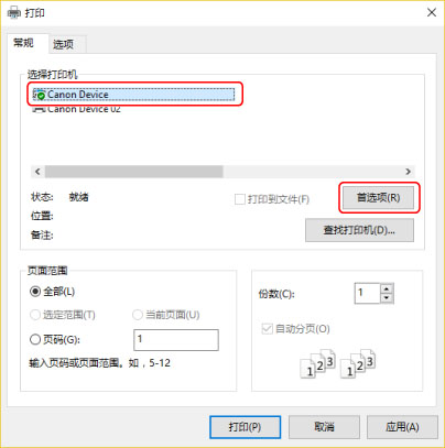 选择所使用的设备 → 单击[首选项]。