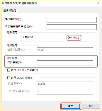(1) 在 [通訊協定] 中選取 [LPR] → 在 [LPR 設定] 的 [佇列名稱] 中指定其中一個列印佇列。
