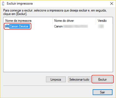 [Limpeza]: Clique nesta opção para excluir simultaneamente todos os arquivos e informações de registro relativos a todos os drivers exibidos na lista, não apenas ao driver selecionado. Clique em [Excluir] para executar uma desinstalação normal do driver.