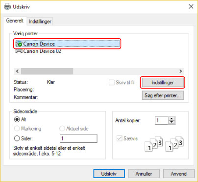 Afhængigt af programmet kan [Indstillinger] også hedde "Printeregenskaber" eller "Egenskaber".