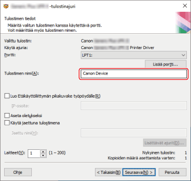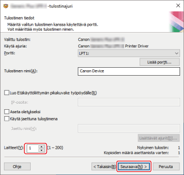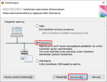 [Tulostinajurin asennus]: Valitse tämä tarvittaessa, jos ajuri on jo asennettu.