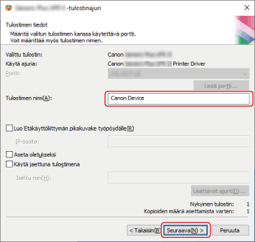Jos haluat muuttaa laitteen nimeä tai asettaa sen oletuslaitteeksi, valitse [Tulostintietojen määritys] → valitse [Seuraava].
