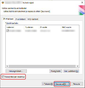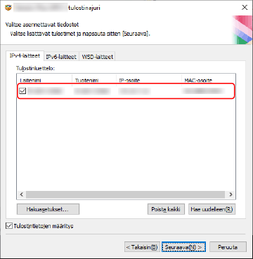 [IPv4-laitteet]/[IPv6-laitteet]/[WSD-laitteet]-välilehti: Hakutulokset näytetään laitteen yhteystapaa vastaavalla välilehdellä. Siirry välilehteen napsauttamalla sitä.