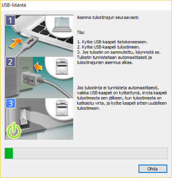 Kun seuraava näyttö tulee näkyviin, yhdistä laite ja tietokone USB-kaapelilla → kytke laitteeseen virta.