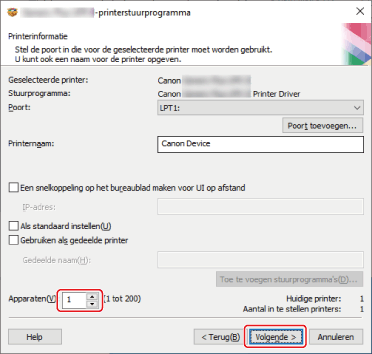 Als u op [Volgende] klikt, wordt de verandering in [Apparaten] toegepast op [Huidige printer] en [Aantal in te stellen printers].