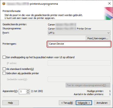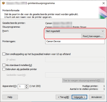 Als u een netwerkprinterpoort hebt geselecteerd, kunt u [Printernaam] en [Gebruiken als gedeelde printer] niet instellen.
