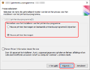[Verwerken voor het installeren van het printerstuurprogramma]: Selecteer dit indien nodig als er al een stuurprogramma is geïnstalleerd.