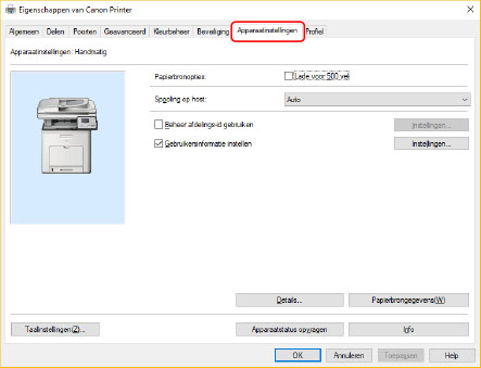 Met deze instellingen kan het stuurprogramma de functies van het apparaat gebruiken en correct afdrukken.
