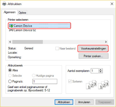 Selecteer het door u gebruikte apparaat → klik op [Voorkeursinstellingen].