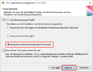 Selecteer [Bestaande printerstuurprogramma's bijwerken] voor [Verwerken voor het installeren van het printerstuurprogramma] → klik op [Volgende].