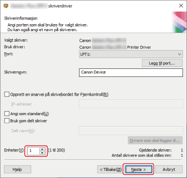 Når du klikker på [Neste], knyttes endringen i [Enheter] til [Gjeldende skriver] og [Antall skrivere som skal stilles inn].