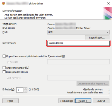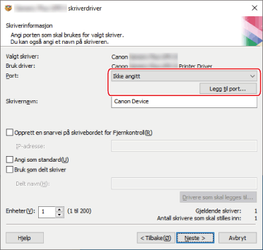 Hvis du valgte en port for nettverksskriver, kan du ikke angi [Skrivernavn] og [Bruk som delt skriver].