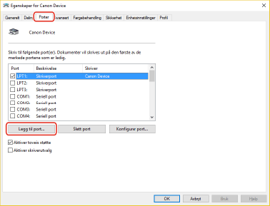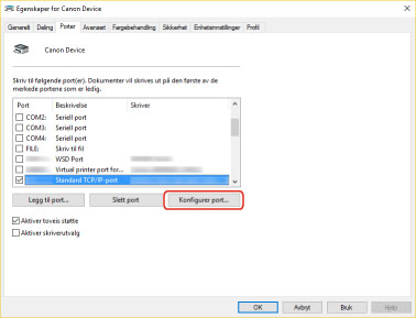 Dette forklarer prosedyren for å bytte porten som brukes av en enhet tilkoblet av et nettverk til en standard TCP/IP-port. Hvis du midlertidig tilordner en port til en enhet når du installerer driveren, kan du endre den til riktig port ved å følge denne prosedyren.