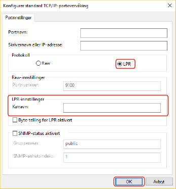 (1) Velg [LPR] for [Protokoll] → spesifiser én av skriverkøene for [Kønavn] i [LPR-innstillinger].
