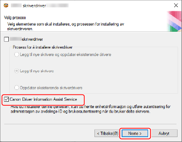 Avbryt driverutvalg → velg [Canon Driver Information Assist Service] → klikk på [Neste].