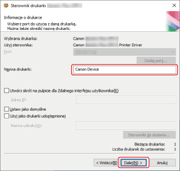 W razie potrzeby zmień wartość w polu [Nazwa drukarki] → kliknij przycisk [Dalej].