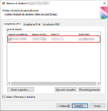 [Wyszukaj ponownie]: Kliknij tę opcję, jeśli urządzenie nie jest wyświetlane w obszarze [Lista drukarek]. Jeśli urządzenie nadal nie jest wyświetlane po ponownym wyszukaniu, wybierz opcję [Niestandardowa] i zainstaluj je, podając port lub adres IP.