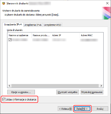 Aby zmienić nazwę urządzenia albo ustawić je jako domyślne, zaznacz opcję [Ustaw informacje o drukarce] → kliknij przycisk [Dalej].